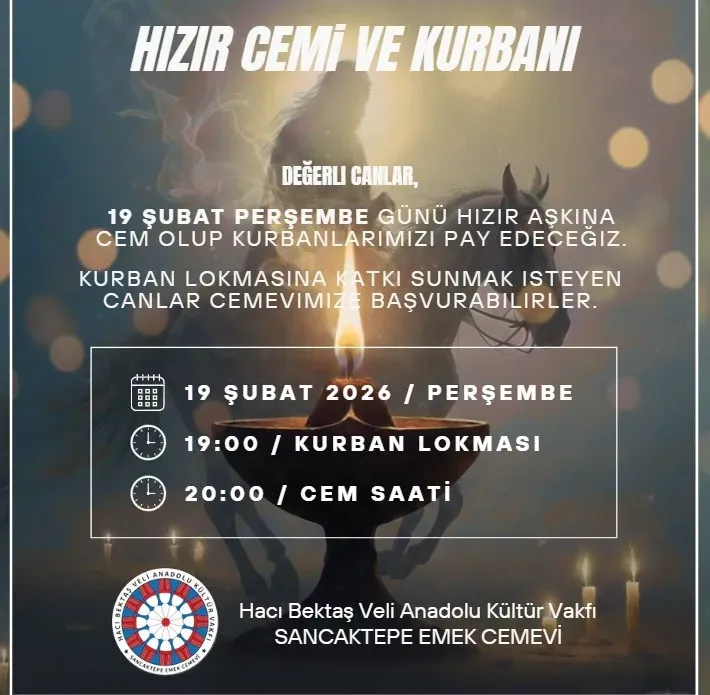 Hacı Bektaş Veli Anadolu Kültür Vakfı Sancaktepe Emek Cemevi, 9 Şubat 2026 Perşembe günü anlamlı bir etkinliğe ev sahipliği yapacak. Saat 19.00’da başlayacak programda, Hızır Cemi gerçekleştirilecek ve kurban lokmaları canlarla paylaşılacak.